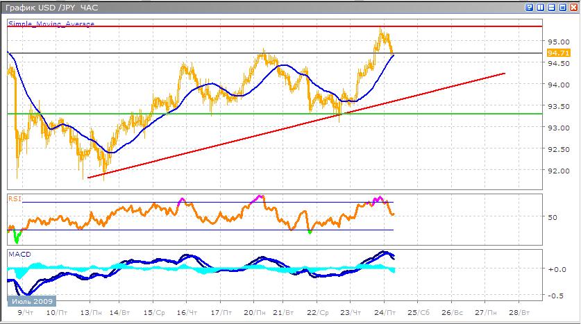 Японская валюта наконец снижается, что сильно порадовало игроков фондовых рынков, результатом чего стал повышенный спрос на бумаги главных экспортеров-производителей Японии. Пара, после встречи с уровнем сопротивления 95.30, снижается, при этом перспективы медвежьего сценария все лучше. Японские аналитики отнеслись с недоверием к сегодняшнему росту в Японии, индекс Nikkei 225 вырос до рекордных уровней, при этом дальнейший рост не совсем жизнеспособен. В связи с этим, рост пары сильно ограничен, а в среднесрочной перспективе ожидается падение. Технические индикаторы достаточно наглядно предупреждают участников торгов о снижении. Гистограмма осциллятора MACD стремительно снижается, при этом скользящие средние индикатора также не сулят ничего хорошего покупателям. График RSI, выйдя из зоны перекупленности, также падает, приближаясь к средней линии. Привлекательность продаж сейчас максимальна, риск таких сделок относительно не велик.