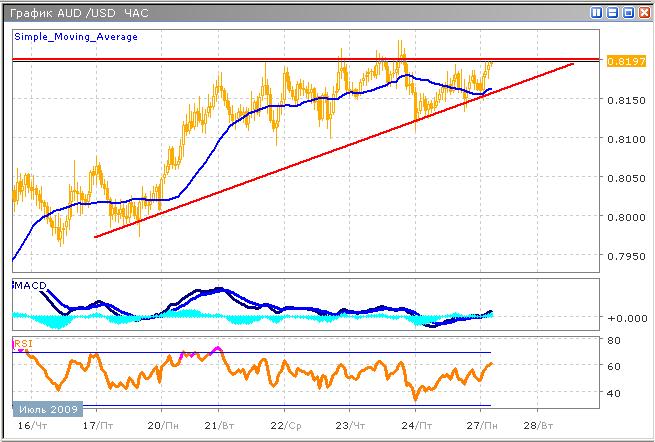 Встреча быков с уровнем сопротивления 0.8200 не стала неожиданностью, поскольку пара тестирует этот уровень уже неделю. В данный момент, в среднесрочной перспективе, пара продолжит рост с долгосрочной целью 0.8500, но достижение этого уровня займет много времени. Технический анализ информирует о вероятном усилении возрастающего тренда, поэтому в течение сегодняшней сессии рост имеет значительный потенциал после пробоя уровня. Осциллятор MACD демонстрирует рост, однако низкая активность все еще не дает ценам взлететь. График индекса относительной силы, только приближается к области перекупленности, что дает некоторую надежду на продолжение роста.