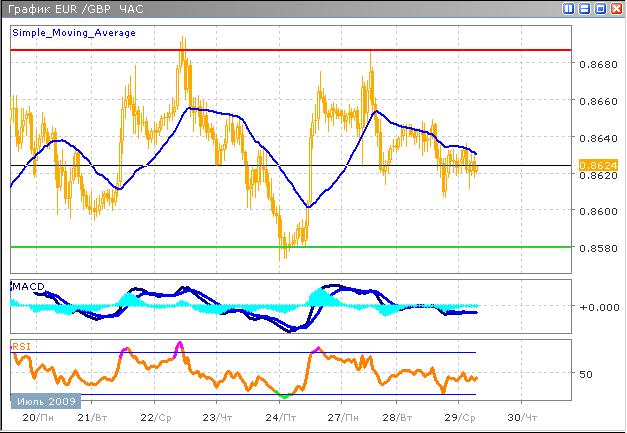 Укрепление британского фунта против доллара завершилось очередным тестированием уровня поддержки по данной паре 0.8620. технические индексы указывают на продолжение нисходящего тренда, на это указывают и фундаментальные факторы. Вероятно, поддержка не будет преодолена с первого раза, поэтому пара может продолжить колебания внутри бокового коридора еще некоторое время. Технические индикаторы в текущих условиях подают достаточно надежные сигналы, которые обычно искажаются резкими бросками. Умеренное снижение в течение последней недели имеет все шансы продолжиться в среднесрочной перспективе, в результате можно ожидать тестирования отметок 0.8580 к концу этой недели.