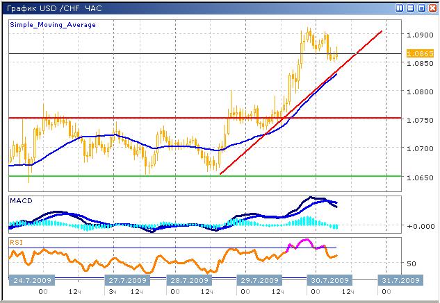 Торги по-прежнему сопровождаются высокой волатильностью, что в значительной мере затрудняет прогнозирование дальнейшего движения. В настоящий момент сложилась достаточно не простая ситуация, технические факторы накладываются на фундаментальные, вступая в противоречия между собой. Технические индикаторы сигнализируют о продолжении роста, гистограмма MACD формирует локальный минимум на часовом графике, но, вероятно, рост продолжится. В краткосрочной перспективе ожидается снижение, цена находится у уровня сопротивления 1.0900 осциллятор MACD подает двойной сигнал к продаже, пересекая гистограммой нулевую ось, и формируя соответствующее пересечение скользящих средних индикатора. Индекс RSI пребывает под областью перекупленности, тестируя нижнюю границу, пробой которой подтвердит сигналы MACD.