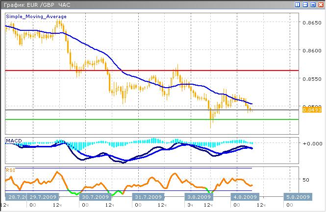Снижение пары ограничено уровнем 0.8480, около которого на протяжении нескольких часов цена лежит в боковом тренде. После активного роста ожидается снижение цен, и в дальнейшем колебания в широком диапазоне, поскольку нисходящий тренд, вероятно, завершается. Поддержка 0.8480 достаточно прочна, поэтому медведи не смогли взять ее сразу. В среднесрочной перспективе, ожидается снижение цены у этому уровню, однако, для преодоления его рынку понадобится значительные усилия, что будет выражаться в длительном боковом движении. Технические индикаторы указывают на тестирование уровня, однако потенциал снижения низок. Гистограмма MACD, пробивает в нисходящем направлении нулевую ось, в то время как скользящие средние индикатора подают сигнал на продажу. График индикатора RSI пересекает среднюю линию, сигнализируя о снижении цен, однако, падение индикатора замедлилось, что несколько обескураживает продавцов. В настоящий момент рекомендуется дождаться начала нисходящего тренда, и войти в рынок с короткой позицией от уровня поддержки.