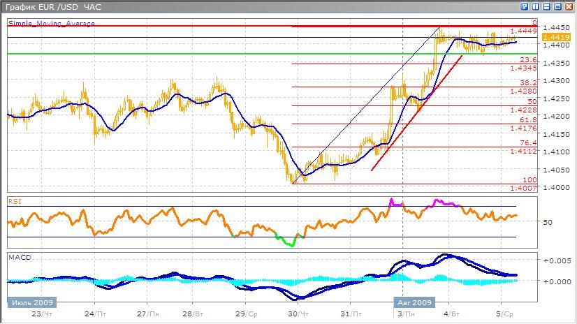 На фоне ожиданий выхода данных по платежным ведомостям в США, пара торгуется в узком боковом коридоре. Наиболее вероятно, что ситуация изменится после начала торгов в Европе. Американские рынки завершили день в слабом плюсе, инвесторы фиксировали прибыль после активного роста, поэтому интерес к доллару будет слабым, даже в случае снижения рынков. В краткосрочной перспективе ожидается слабый рост, который обусловлен более техническими факторами, нежели фундаментальными. Гистограмма осциллятора MACD указывает на ослабление моментума нисходящей коррекции, сформировав локальный минимум и приблизившись к нулевой отметке. Скользящие средние индикатора пересекаются таким образом, что образуется сигнал к покупке. График индикатора RSI коснувшись средней линии, при движении сверху вниз, развернулся, что также указывает на большую активность покупателей.