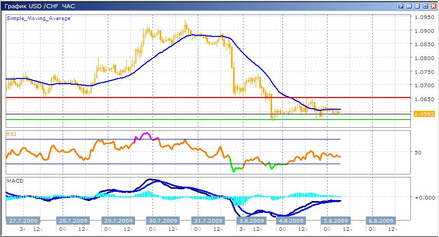 Снижение пары встретило уровень поддержки 1.0570, снижение завершилось, однако шансы на продолжение тренда очень велики. Причиной этому могут послужить фундаментальные и технические факторы, в ближайшем будущем ожидается завершение бокового тренда и продолжение снижения. Технические индикаторы указывают на предстоящее снижение, осциллятор MACD близок к подаче двойного сигнала к продаже, в то время как график RSI, выйдя из области перепроданности, приблизился к средней линии, и развернулся в нисходящем направлении. Швейцарский франк, в среднесрочной перспективе, продолжит укрепление против доллара США, пробой текущей поддержки — лишь вопрос времени.