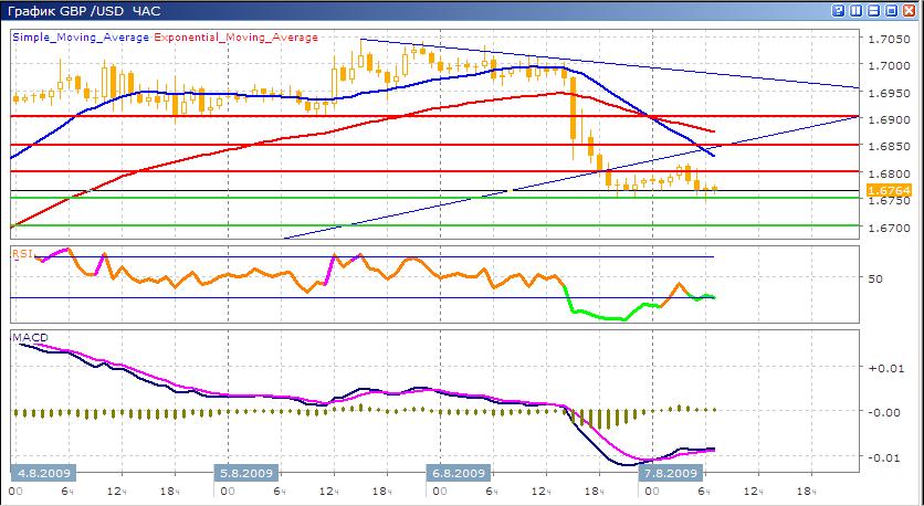 Паре не удалось закрепиться выше уровня 1.7000 и вчерашним движением вниз она достигла уровня 1.6750, на котором она нашла поддержку и который с конца вчерашнего торгового дня тестирует на прорыв вниз. Средние скользящие ЕМА21 и ЕМА55 подали сигнал о движении вниз — ЕМА21 пересекла вниз ЕМА55. Индикаторы MACD и RSI также говорят о преобладании нисходящего движения, находясь достаточно далеко от своих центральных линий. RSI при этом находится чуть выше уровня перепроданности и совместно с MACD говорит о возможности краткосрочной покупки. Движение вверх будет нацелено на тестирование уровня 1.6800, движение выше уровня 1.6850 будет осложнено сопротивлением идущих вниз средних скользящих ЕМА21 и ЕМА55, а также нижней границей восходящего движения, начавшегося 30 июля. Движение вниз будет иметь целью закрепление ниже 1.6750 и дальнейшее продвижение к уровню 1.6700. Если удастся преодолеть и его, то пара будет нацелена на уровень 1.6600.