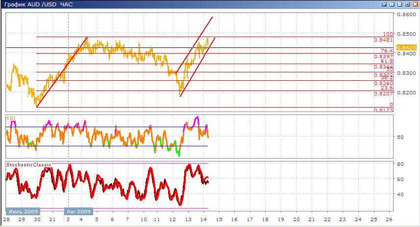 Сейчас австралийский доллар торгуется в коридоре, между двумя линями поддержки и сопротивления. Скорее всего этот коридор будет пробит на вниз из-за того что он ударился в отметку 100 по Фибоначчи и откатился вниз. Восходящий тренд уже завершается , т.к. очень сильное сопротивление на уровне 0.8480, очень серьезный максимум для данной валютной пары. Его помог достигнуть положительная статистика и речь главы Резервного Банка Австралии Гленна Стивенса. Скорее всего произойдет смена тренда на медвежий, и отскок к уровню 50% по Фибоначчи.