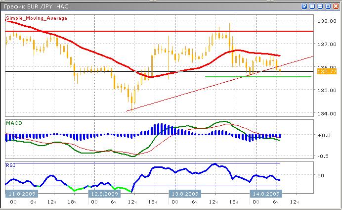 Несмотря на рост котировок акций на фондовых рынках Азии, японская иена укрепляется против доллара США, вопреки ожиданиям снижения. Единая валюта, напротив, теряет позиции против доллара на сегодняшних ранних торгах. Коррекция непродолжительного восходящего тренда по паре встретила локальную поддержку на уровне 135.50, после чего цены подскочили на фигуру и вновь снижаются. В краткосрочной перспективе ожидается возврат бычьему тренду, с целью 137.50. Технические индикаторы сигнализируют о предстоящем краткосрочном росте, так гистограмма MACD пересекла сигнальную линию и скользящую среднюю снизу вверх, подавая сигнал на покупку. Однако, замедление темпов роста гистограммы указывает на слабость покупателей, в результате чего перед ростом возможно непродолжительное развитие бокового тренда. Индикатор RSI указывает на слабость участников торгов с обоих сторон, тем не менее, потенциал роста превышает потенциал снижения. В настоящий момент рекомендуется дождаться завершения снижения пары, и занять длинную позицию вплоть до следующего сопротивления.