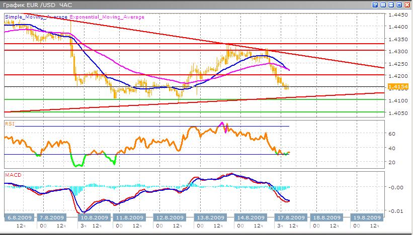 Всю прошлую неделю пара двигалась в диапазоне 1.4100-1.4300. причем, если первая половина недели прошла род знаком продавцов, пытавшихся опустить пару ниже уровня 1.4100, то вторая половина недели прошла преимущественно под контролем покупателей, старавшихся преодолеть уровень 1.4300. На часовом графике видно, что с начала августа сформировался сходящийся треугольник, выход из которого (краткосрочно) более вероятен вниз. Начало сегодняшних торгов показывает пока некоторое преимущество продавцов. Индикатор RSI близок к тому, чтобы уйти ниже линии перепроданности, индикатор MACD (хотя и показывает некоторый рост) также говорит о доминировании нисходящего тренда. При продолжении движения вниз пара получит поддержку на уровне 1.4100 и от проходящей там же нижней границы треугольника. При преодолении этой поддержки пара нацелится на 1.4050. Движение вверх поступательно будет встречать сопротивление на уровне 1.4200, 1.4230 (от средних скользящих ЕМА21 и ЕМА55).