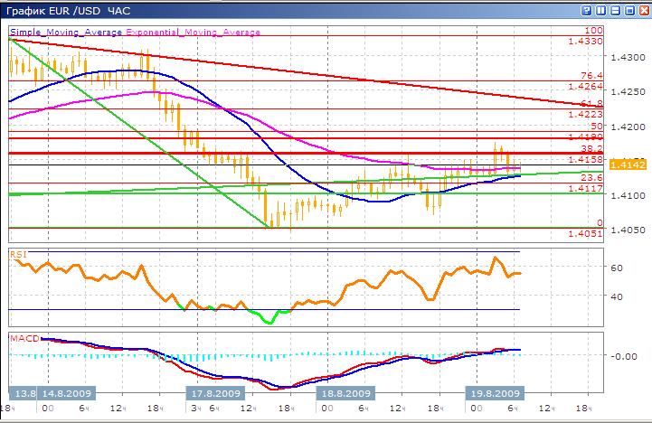 Получив поддержку 17 августа на уровне 1.4050, пара за последние два продемонстрировала слабый рост в районе 100 пунктов. С начала сегодняшних торгов пара пока не может преодолеть уровень 1.4060 (уровень восстановления 38,2% Фибоначчи от движения 13 -17 августа). Средние скользящие ЕМА21, ЕМА55, индикаторы MACD и RSI говорят о замедлении и без того слабого роста. При движении вниз пара может получить поддержку в диапазоне 1.4140 — 1.4120 от двух средних скользящих и восходящей поддержки, которую пара пробила вниз 17 августа и выше которой она сейчас торгуется. Следующая потом цель вниз — 1.4100. Движение вверх найдет сопротивление на уровне 1.4060 (уровень восстановления 38,2% Фибоначчи от движения 13 -17 августа) и далее сопротивление 1.4190-1.4200 (где 1.4190 — уровень восстановления 50% от движения 13 -17 августа).