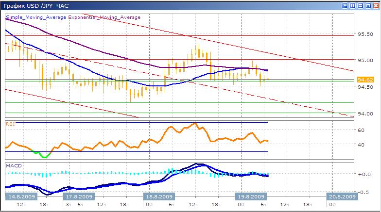 Пара доллар США/японская йена с 10 августа двигается в нисходящем канале. В пределах 94.20-94.40 пара получила поддержку, от которой сейчас корректировалась вверх. Сопротивление средних скользящих ЕМА21 и ЕМА55 в начале сегодняшней торговой сессии так и не было преодолено. Индикаторы MACD и RSI показывают нисходящее движение. Движение вверх может встретить сопротивление на уровне 95.00, его дальнейшее продолжение может натолкнуться на сопротивление верхней границы нисходящего канала. При движении вниз пара получит поддержку на уровне 94.60 (поддержка последних двенадцати часов), при успешном его преодолении движение будет нацелено на 94.19 (сессионный минимум 17 августа).