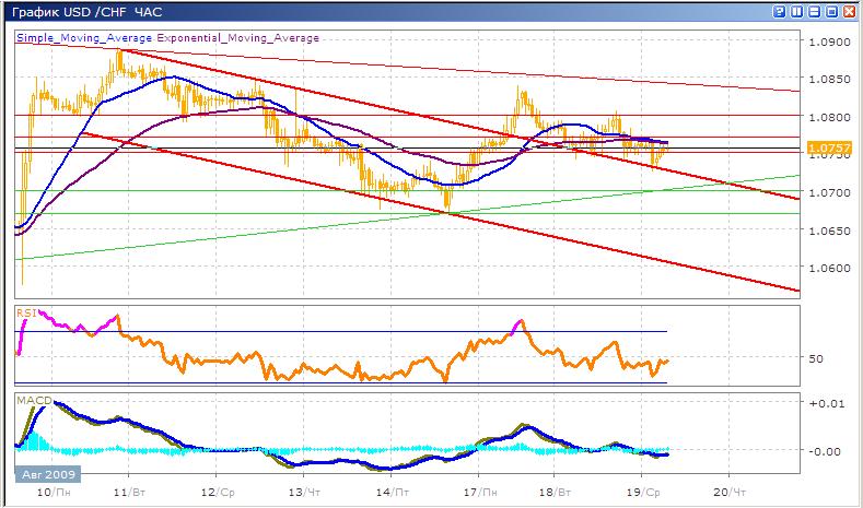 Динамика на часовом графике позволяет говорить, что с самого конца июля пара движется в сходящемся треугольнике с усилившимся в последнее время давлением продавцов, не давших паре существенно далеко отойти от нисходящего канала, в котором она двигалась с 11 августа. Последние три дня пара снижается, находя поддержку у верхней границы этого канала. Если же паре все таки удастся преодолеть эту поддержку в ходе сегодняшних торгов, то весомую поддержку она сможет получить на уровне 1.0700 и от линии поддержки восходящего канала ( с началом от 3 августа). Средние скользящие ЕМА21 и ЕМА55, а также индикаторы MACD и RSI говорят в пользу краткосрочного движения вниз. Движение вверх может встретить сопротивление в диапазоне 1.0760-1.0770, после преодоления которого следующей целью станет тестирование уровня 1.0800.
