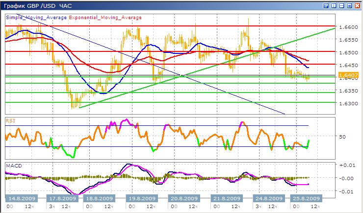 Линия поддержки восходящего тренда после двух дней (21 и 24 августа) проверки на прочность была все-таки пробита и пара устремилась к уровню 1.6400, который является нижней границей бокового тренда 1.6400-1.6600, в котором (если исключить выход из него 17 и 18 августа) пара двигается уже две недели. Если движение вниз сохранит свой импульс и пробьет 1.6400, то пара может двинуться напрямую к 1.6300, преодолевая поддержку на 1.6376 и 1.6340. И хотя средние скользящие ЕМА21 и ЕМА55 пересеклись и идут вниз, индикаторы MACD и RSI (который находится очень близко к зоне перепроданности) говорят о том, что это движение вниз может на этом и закончиться. Отскок вверх от нынешнего уровня 1.6400 можно ожидать к отметке 1.6450 (где пара встретит первое сопротивление), далее движение к 1.6500.