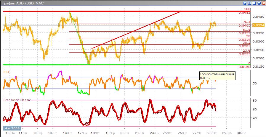 Австралийский доллар пробил предыдущий восходящий канал и отскочил к уровням 38.2 — 76.4% по Фибоначчи, где в данный момент и торгуется. Сейчас валюта находится в боковом движении, и дальнейшие колебания будут также находится в этом коридоре уровней Фибоначчи, а в более широком смысле это нынешние уровни поддержки и сопротивления. Индикаторы технического анализа указывают движение нынешнее в краткосрочном периоде вниз с последующей небольшой коррекцией. Stohastic нарисовал три вершины указывающие вниз, и RSI это также подтверждает выходя из зоны перекупленности.